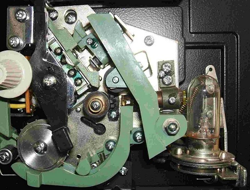 This end of the sound system is very close to being the same as the ST-800M (-other than the obvious...). It has the same film chute, which unfortunately I've been told is both unique to the ST-800 and is a wear point. The curved edge up at the entrance of the chute tends to wear an edge where it flattens the lower loop and if it goes far enough it can put lines into the viewable frame.